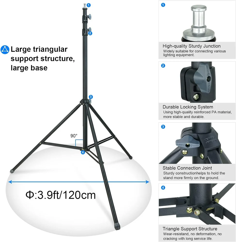 ?Ultra Sturdy Aluminum Light Stand? This professional photography light stand features a full metal build with anodized aluminium alloy, durable and corrosion-resistant. With thickened tube diameters in all 3 sections (28/25/22mm), it has a maximum load capacity of 22.05lb/10kg and can easily support a wide range of photography equipment. Ideal for studio and outdoor photography?Spring Loaded Stable Tripod Stand? The spring-loaded design with a built-in buffer spring effectively protects your equipment from impact damage when you loosen the light stand. The tripod base with spread lever helps further stabilize the stand, especially when playing out the tripod legs. Widely Compatible with Standard Connector? The top of the stand comes with a standard 1/4″ screw and can be used for mounting strobe lights, reflectors, ring lights, LED light panels, umbrellas, softboxes, and other photography equipment. Sandbags(not included) can be placed on the tripod base for balance-keeping